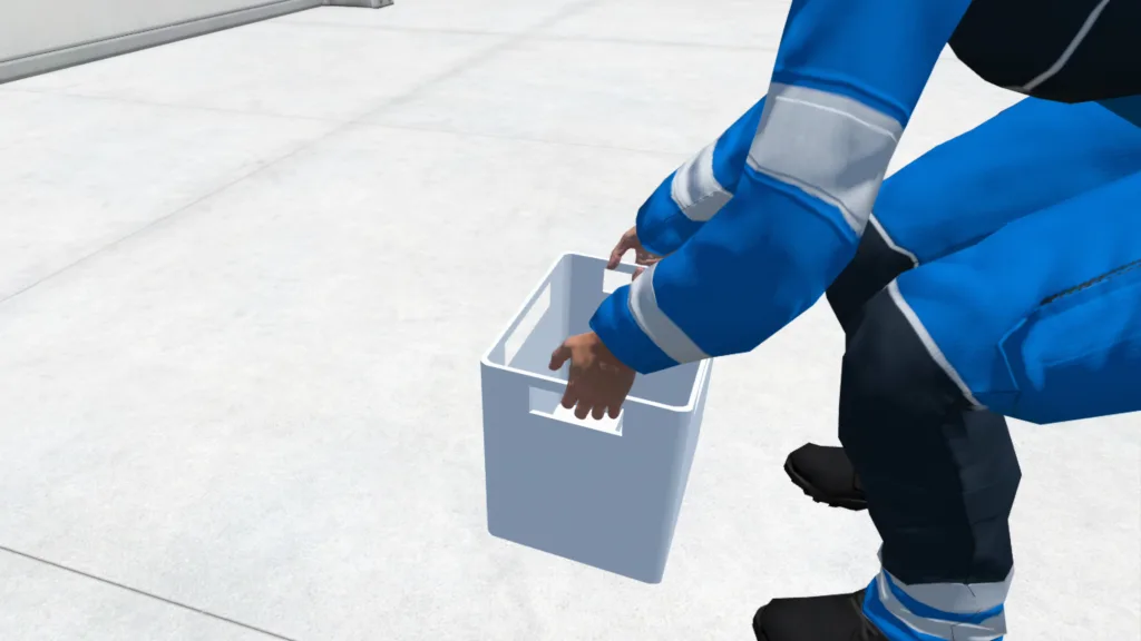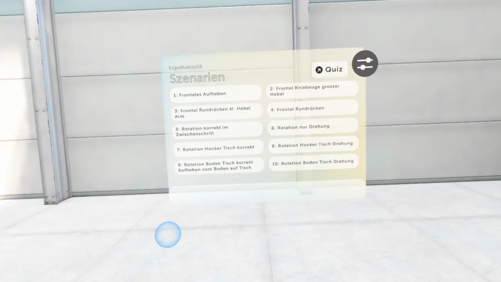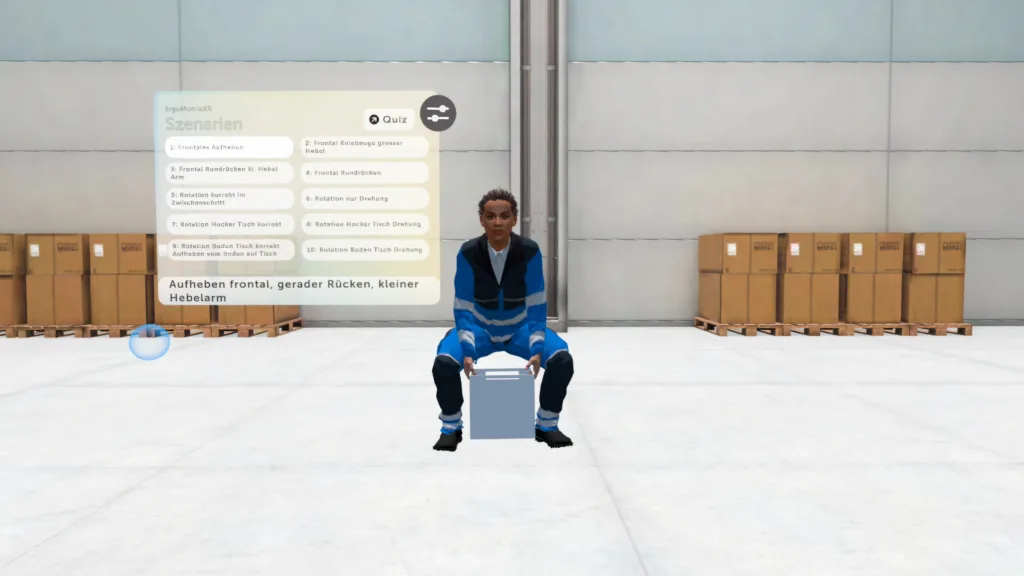 ErgoXR enables structured, scalable, and safe training that makes ergonomic principles tangible through concrete scenarios. Users practice core lifting situations—from front-facing lifts and squat-based techniques to rotation and transfer tasks (e.g., stool-to-table, floor-to-table)—each presented as both correct execution and intentionally demonstrated incorrect variants. VR and MR support focused practice in a virtual environment as well as training in real-world contexts, such as directly at the workplace or in training facilities. Combined with practice and quiz formats, ErgoXR provides a consistent learning pathway that strengthens technique understanding, error recognition, and operational confidence—location-independent, efficient, and highly repeatable. Optional evaluations and structured debriefings further support reflection and help transfer correct technique into everyday work routines.